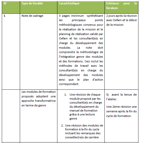 Un groupe de consultant(e)s recruté par Oxfam s’apprête à développer un cursus andragogique pour le compte de conseiller(e)s de carrières au sein des établissements universitaires publics (incluant manuel de formation et organisation de formation de formateur(trice)s). Grace a la présente consultation, Oxfam cherche à compléter ce groupe par un(e) expert(e) genre qui puisse s’assurer que ces outils (manuel et formation) soient transformateurs en terme de genre.