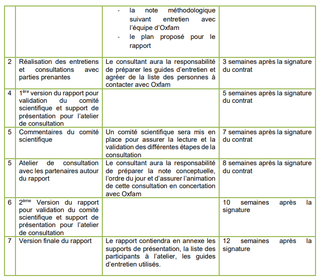 • Le périmètre de la recherche et la méthodologie seront discutés et convenus avec Oxfam dès le commencement de la collaboration. Le (la) consultant(e) présentera l’avancement de la mission lors de réunions périodiques à l’équipe de suivi d’Oxfam, rendant compte des progrès et des défis.