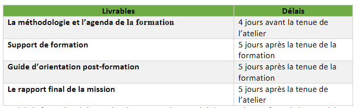 Le matériel de formation doit être développé en arabe, et celui de reporting en francais le matériel sera remis en version éléctronique.