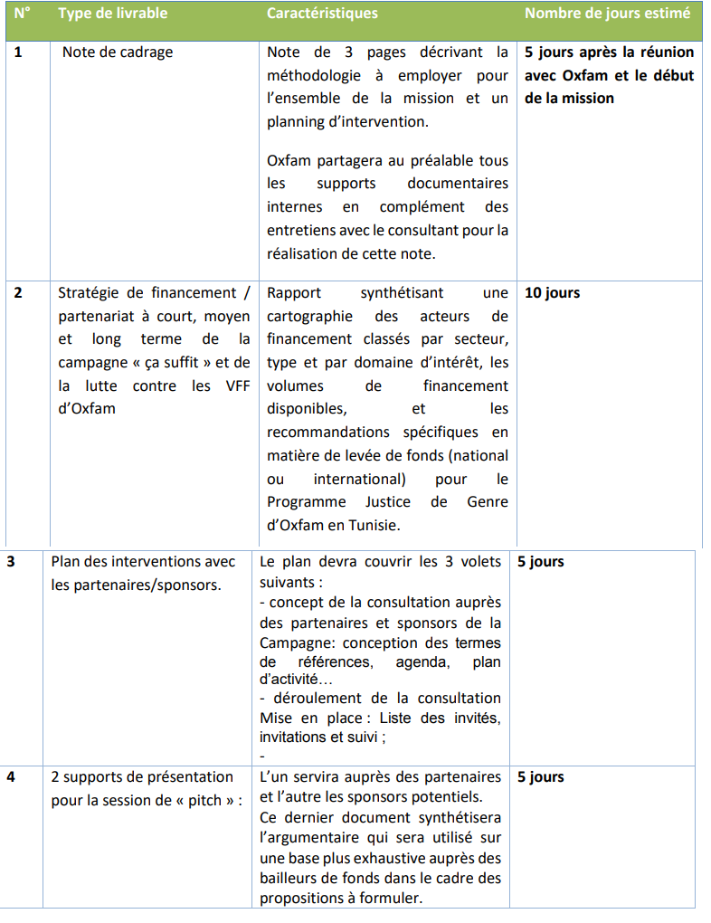 Il est attendu du consultant de travailler en étroite collaboration avec, l’équipe d’Oxfam International et Oxfam Tunisie, chargée de la campagne « ça suffit », qui lui fournira toute la documentation nécessaire à la réalisation de sa mission.