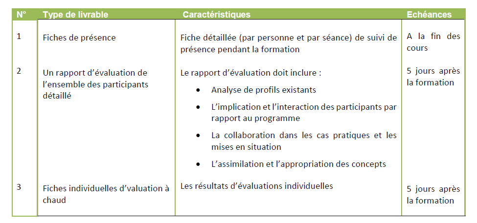 Le cycle de formation aura lieu dans un espace externe pendant les horaires du travail. La formation ne devra pas dépasser 2 jours pleins.