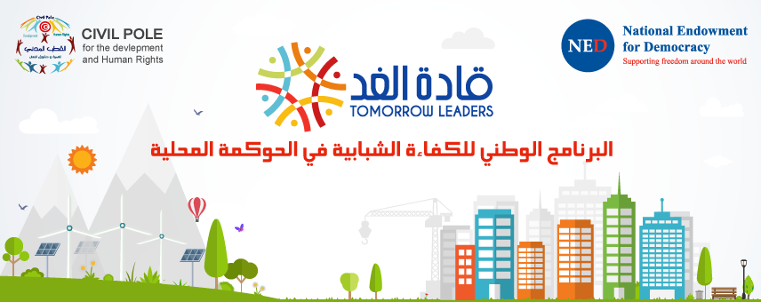 في إطار برنامج قادة الغدء ( برنامج الكفاءة الشبابية في الحوكمة المحلية ) تطلق شبكة القطب المدني للتنمية و حقوق الإنسان استمارة التقديم للمشاركة في سلسلة الدّورات التدريبية المزمع تنظيمها في الشمال و الوسط و الجنوب.
