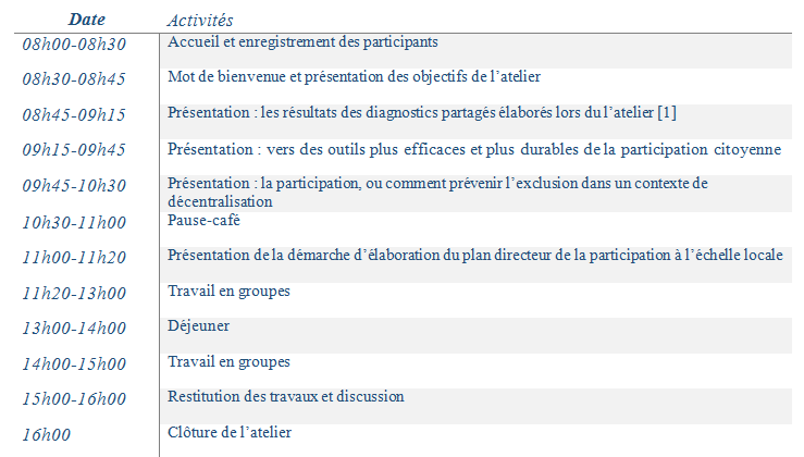 Il propose, à cet effet, une série d’ateliers pour matérialiser le processus de l’élaboration du plan d’action relatif à la participation à l’échelle locale, ce processus devant être participatif et inclusif.