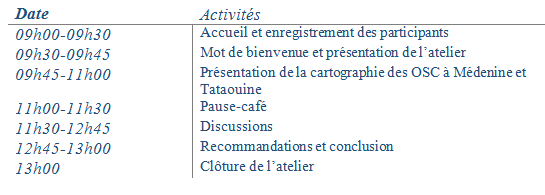 L’objectif général de cet atelier est de restituer les résultats de l’étude de terrain qui a été menée dans le but d’élaborer la cartographie des organisations de la société civile aux gouvernorats de Médenine et Tataouine.