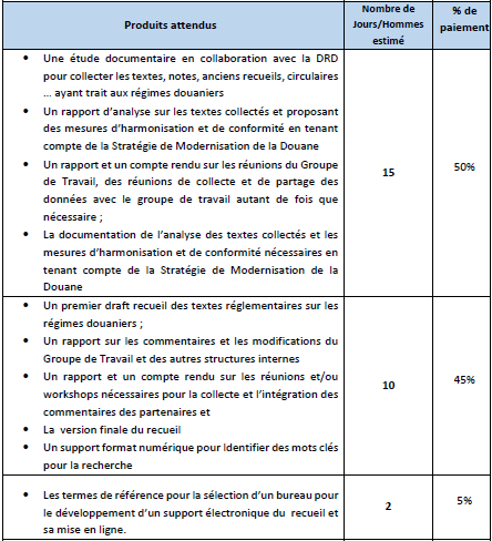 Sous la supervision du Coordinatrice de la composante institutionnelle du projet, le(a) consultant.e aura pour mission principale d’élaborer un recueil des textes sur les régimes douaniers. Ce recueil sera un outil à la disposition de tous les intervenants (DRD, autres services des douanes, et entreprises et autres acteurs économiques intéressés) pour permettre une meilleure gestion des procédures douanières en la matière. Ce recueil sera ensuite mis en ligne et doté d’un outil intelligent de recherche.