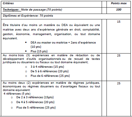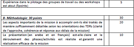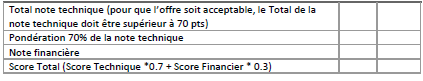 L’évaluation fera l’objet d’une sélection au mieux-disant sur la base d’une grille de notation et en tenant compte de la pondération sur la note technique et financière respectivement de 70% et 30%.
