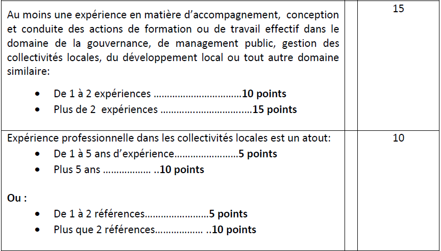 • Au moins une expérience en matière d’accompagnement, conception et conduite des actions de formation ou de travail effectif dans le domaine de la gouvernance, de management public, gestion des collectivités locales, du développement local ou tout autre domaine similaire