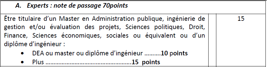 • Être titulaire d’un Master en Administration publique, ingénierie de gestion et/ou évaluation des projets, Sciences politiques, Droit, Finance, Sciences économiques, sociales ou équivalent ou d’un diplôme d’ingénieur