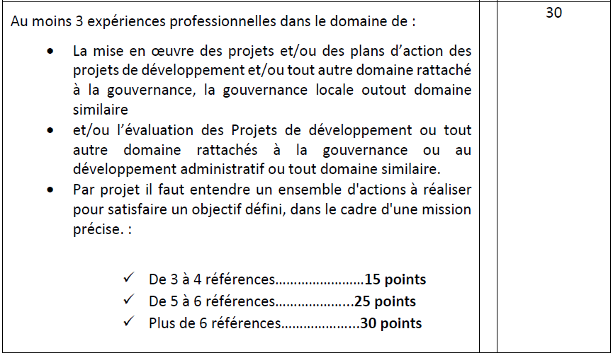 • Au moins 3 expériences professionnelles dans le domaine de : • La mise en oeuvre des projets et/ou des plans d’action des projets de développement et/ou tout autre domaine rattaché à la gouvernance, la gouvernance locale outout domaine similaire • et/ou l’évaluation des Projets de développement ou tout autre domaine rattachés à la gouvernance ou au développement administratif ou tout domaine similaire. • Par projet il faut entendre un ensemble d'actions à réaliser pour satisfaire un objectif défini, dans le cadre d'une mission précise.