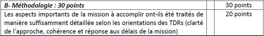 L’évaluation fera l’objet d’une sélection au mieux-disant sur la base d’une grille de notation et en tenant compte de la pondération sur la note technique et financière respectivement de 70% et 30%.