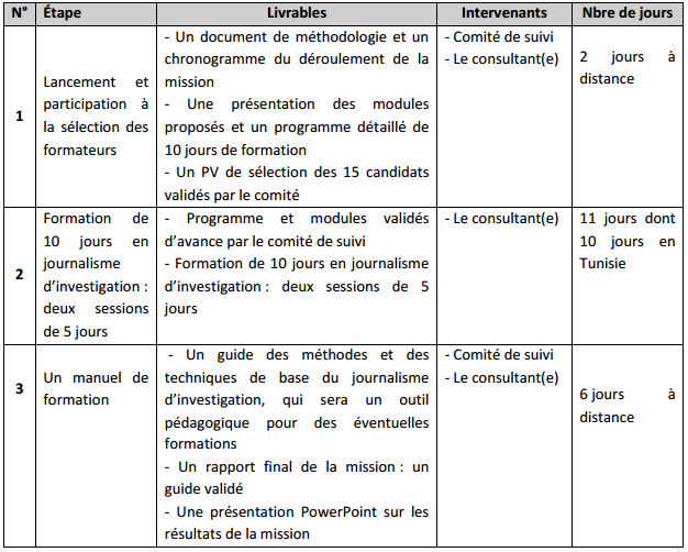 Le consultant(e) rédigera un guide pratique des méthodes et des techniques de base du journalisme d’investigation. Il mettra en place les mécanismes de pilotage et de communication requis. Ce manuel sera l’outil des formateurs pour d’éventuelles formations sur le même thème.