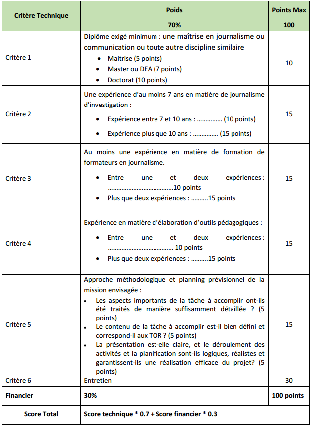 Seules les candidatures ayant obtenu un minimum de 70 points suite à l’évaluation technique seraient considérées pour l’évaluation financière.