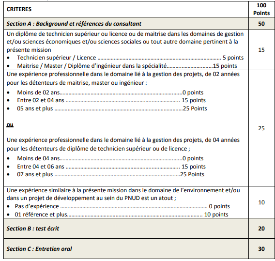NB : les candidats ayant obtenus 35 points ou plus à l’évaluation du dossier technique (section A de la grille d’évaluation) seront convoqués pour passer un test écrit (section B) et un entretien oral (section C)