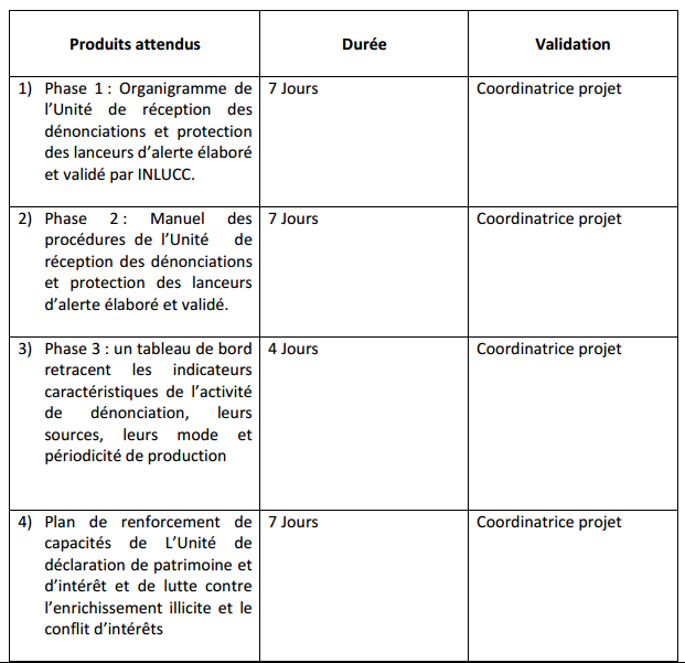 L’expert renforcera les capacités des membres de l’Unité réception des dénonciations et de la protection des lanceurs d’alerte en matière d’utilisation des outils organisationnels développés.