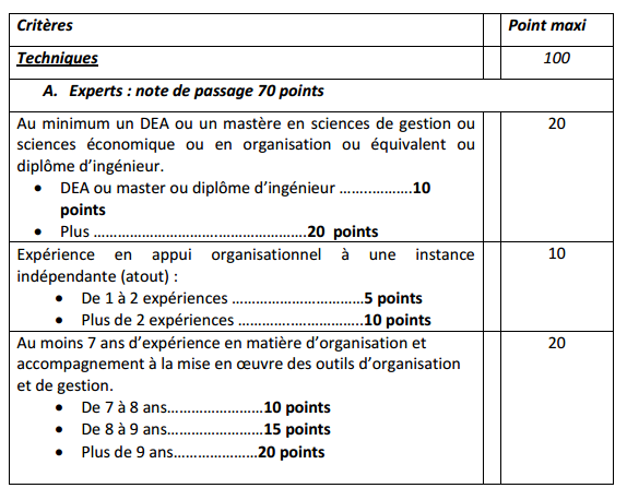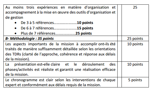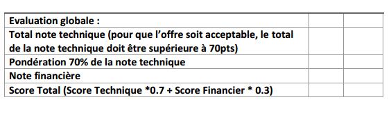 L’évaluation fera l’objet d’une sélection au mieux-disant sur la base d’une grille de notation et en tenant compte de la pondération sur la note technique et financière respectivement de 70% et 30%.