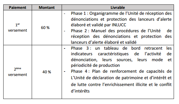 La mission a pour but d’appuyer l’INLUCC pour se doter des outils organisationnels nécessaires pour le bon fonctionnement de l’Unité de réception de dénonciation de la corruption et protection des lanceurs d’alerte, notamment à travers le numéro vert de l’instance, le site web et l’application mobile, et l’analyse des besoins en renforcement de capacités pour le volet déclaration de patrimoine et d’intérêts et lutte contre l’enrichissement illicite et les conflits d’intérêts