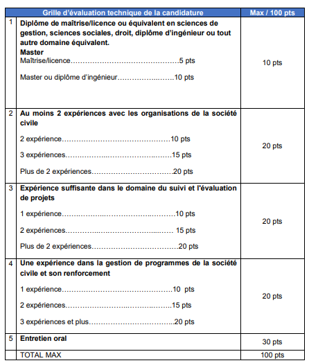 Les candidatures reçues seront évaluées par un panel de sélection suivant la grille d’évaluation défini ci dessous :