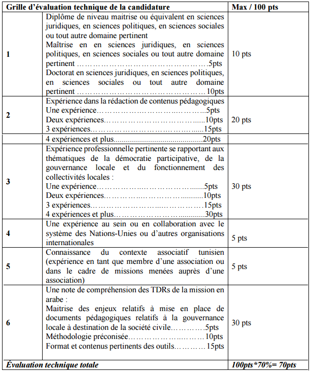 Dans le cadre de son projet «Tamkeen pour la promotion de la citoyenneté, le renforcement de la cohésion sociale et de la société civile en Tunisie», le Programme des Nations Unies pour le Développement (PNUD) en Tunisie, recrute «deux experts nationaux pour l’élaboration d’outils pédagogiques relatifs à la gouvernance locale à destination des acteurs de la société civile».