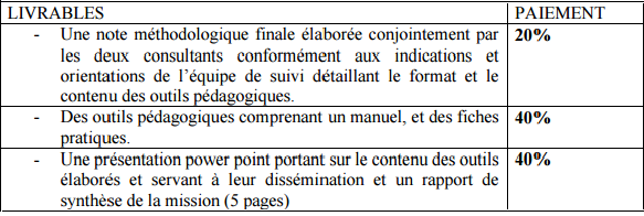 Les consultants devront travailler conjointement sous la supervision de l’équipe de suivi du projet pour l’élaboration des outils pédagogiques.