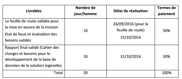 Intervention de l’expert(e) contracté(e) : La durée de la mission est de 20 jours allant du 19 septembre 2016 au 31 octobre 2016. La mission inclut des jours de travail :