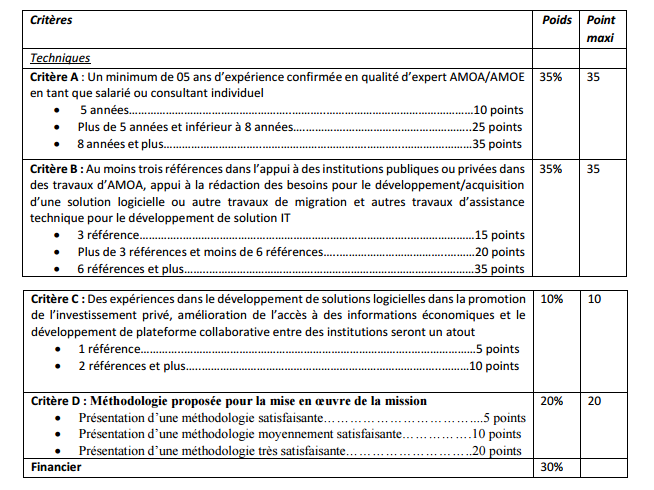 Seuls les candidats ayant obtenu un minimum de 70 points serait considéré pour l’évaluation financière.
