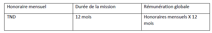 Proposition financière et modalités de paiement : Le Consultant devra faire parvenir une Offre financière sur la base d’un taux mensuel d’honoraires incluant tous ses frais (tout compris) comme suit :