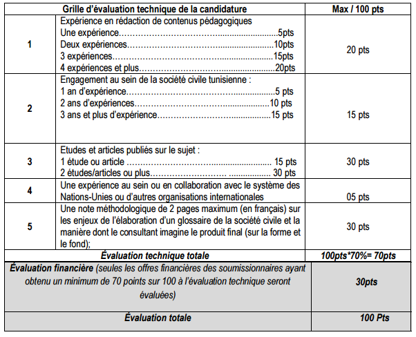 Les candidatures reçues seront évaluées par un panel de sélection selon la grille de compétences techniques définie ci-dessous, sur la base des documents envoyés. méthode d’évaluation combinée sera utilisée. Le contrat sera attribué au consultant ayant présenté l’offre évaluée comme étant :