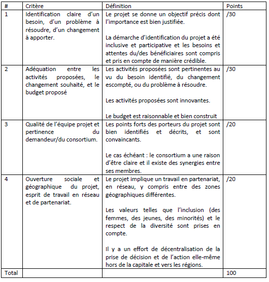 Une attention particulière sera accordée aux projets ayant une valeur ajoutée dans le domaine de la décentralisation, et bénéficiant aux jeunes et aux femmes.