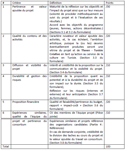 Si votre dossier est retenu à l’étape de la note conceptuelle, le projet Tfanen – Tunisie Créative vous en notifiera par email en vous invitant à soumettre un dossier complet (la date exacte de soumission du dossier complet vous sera communiquée dans le courrier, une date indicative est fournie dans le calendrier du paragraphe 2.1.)