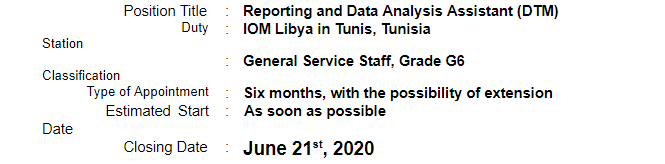 Under the overall supervision of the Deputy Chief of Mission and direct supervision of the Programme Coordinator of Displacement Tracking Matrix (DTM), the DTM Reporting & Analysis Assistant will be responsible for the responsibilities listed below.