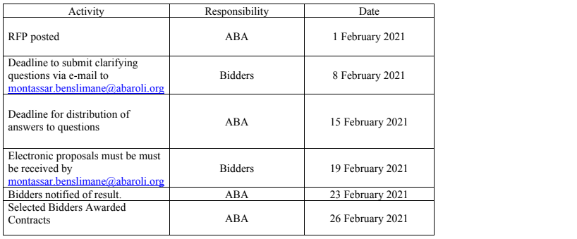 1.1 Purpose. This request for proposal (RFP) provides to those interested in submitting proposals (“Bidders”) sufficient information to enable them to prepare and submit proposals for The American Bar Association Rule of Law Initiative Tunisia office.