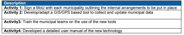 • The procedures, techniques, data collection and geolocation technology to be used for the collection of data, including geolocation to close any gaps in coverage or quality. The applicant is expected to consult regularly with the relevant department at the Ministry of Local Affairs (MoLA) to ensure compatibility with related information systems, notably the national application GRB (Management of Budgetary Resources).