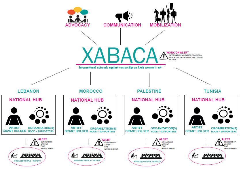 Xabaca cherche à contribuer à l’empowerment des femmes artistes arabes comme source de transformation sociale et de défense des Droits Humains, en défendant et protégeant leur liberté d’expression et leur création artistique.