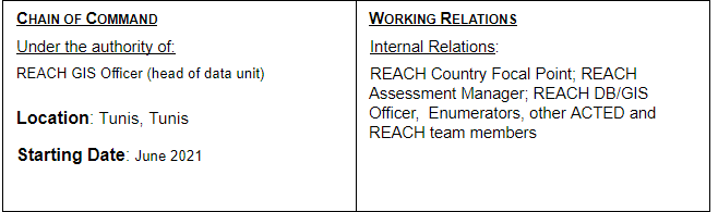 ∙ In coordination with the REACH Country Focal point, under the direct supervision of the REACH Data/GIS Officer, participate in coordination platforms based in Tunis as needed and relevant