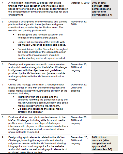 The following deliverables and payment structure are expected from this consultancy. Due dates in the table below are approximate and subject to change based on the actual date of signature of contract:
