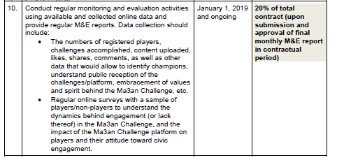 The process of developing, implementing, managing, and monitoring the gaming platform and its associated communication and social media strategy will be led by the external company in close collaboration with the Ma3an team in order to constantly ensure alignment with the Ma3an project’s objectives and values.