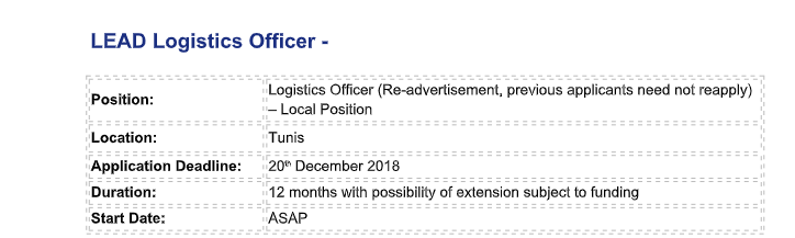 SPARK is looking for LEAD Logistics Officer to support SPARK’s LEAD operations and projects in Tunis, Libya and Somalia/Land. Under the supervision and guidance of the LEAD Regional Admin & Finance Manager, the Logistics Officer will provide assistance to SPARK’s office and ensure that SPARK’s office is well maintained and supplied. LEAD Logistics Officer will be responsible for: