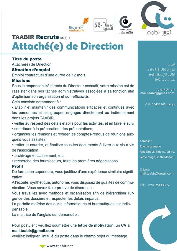 TAABIR Recrute un(e) Attaché(e) de Direction Retour vers les opportunités