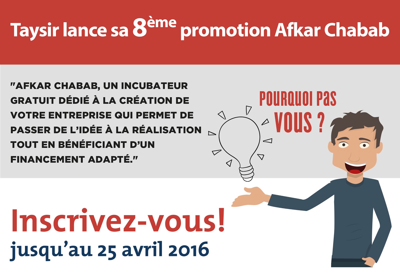 Afkar Chabab est un parcours d’accompagnement proposé par Taysir Conseil qui permet aux jeunes de moins de 35 ans et porteurs d’idées de projet de consolider et réaliser leurs business plan avec la possibilité d’obtenir le financement approprié à leurs micros projets.