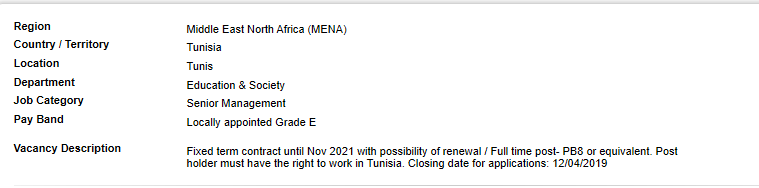 S/he will act as the programme lead, co-ordinating the strategic vision to achieve its aims in advancing culture and development in Tunisia. Additional key responsibilities include managing internal and external resources to meet business targets, delivery milestones and client deadlines. Using the British Council’s standards, policies and frameworks, the Senior Programme Manager will ensure that Tfanen is managed in a way that maximises client satisfaction, compliance with British Council internal policy, compliance with EU contractual requirements and contribution to cultural relations impact.