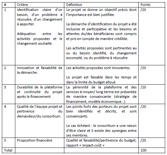 Important : considérant la durée des projets finançables et l’enveloppe allouée à cet appel, il ne sera pas possible de financer des refontes complètes de sites web ou des développements lourds et risqués techniquement. La faisabilité des projets sera donc un critère important de sélection.