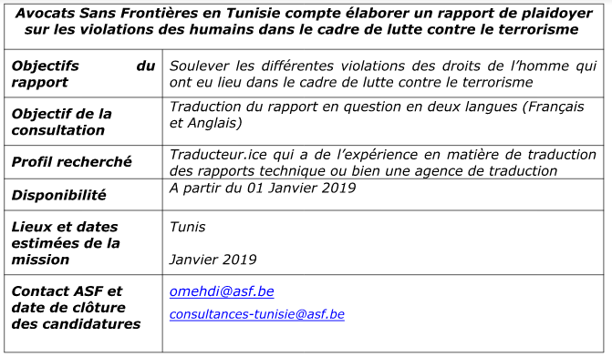 Comme cité dans le paragraphe au-dessus, le projet cherche à renforcer le débat sur les politiques mises en place par les décideurs pour la lutte contre le terrorisme et dénoncées par plusieurs organisations de la société civile pour les violations des droits commises dans ce cadre. Pour le faire, ASF a prévu de réaliser un rapport sur les violations des droits résultant de la mise en œuvre des politiques antiterroristes du gouvernement afin de mettre en avant les violations et les dégâts résultants de telles politiques. Ce rapport élaboré en langue Arabe doit être publié et accessible aux différents acteurs qui travaillent sur cette thématique et aux différents intervenants. Pour le faire, ASF a prévu de traduire ce rapport en Français et en Anglais.
