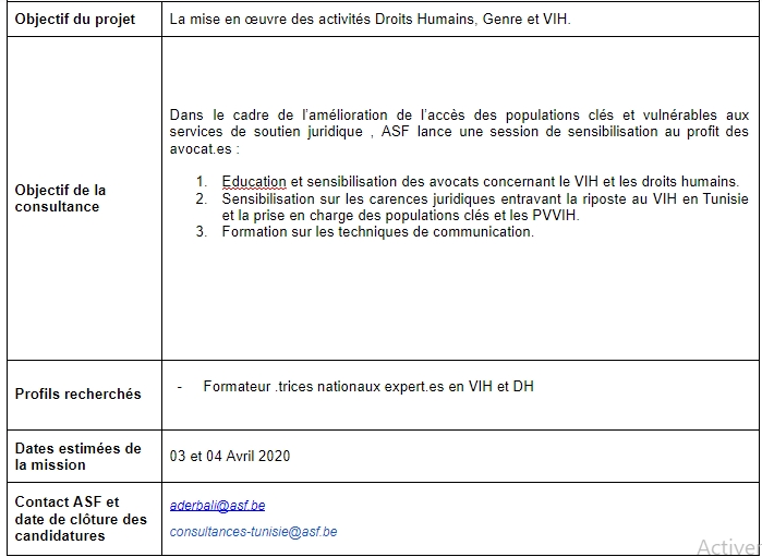 Dans le cadre de la mise en œuvre de la subvention VIH Sida du programme de partenariat avec le Fonds Mondial de lutte contre le Sida, la tuberculose et le paludisme, Avocats sans frontières recrute trois Formateur .trices nationaux expert.es en VIH et DH pour l’animation d’une session de sensibilisation au profit des avocat.es sur le VIH, les droits humains et les techniques de communication.