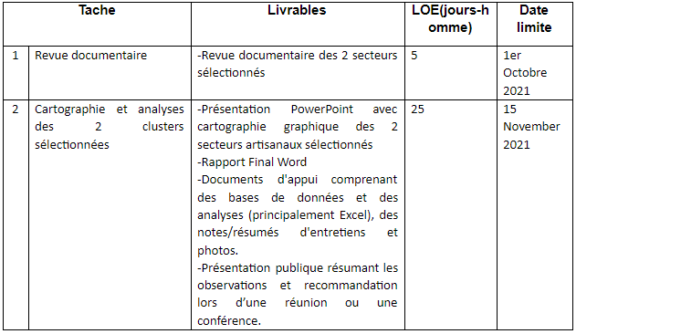 Le projet ACEA apportera son soutien à deux chaînes de valeur artisanales supplémentaires. ACEA recherche un consultant individuel ou un bureau de conseil pour aider à l’analyse et à la cartographie des deux secteurs artisanaux additionels sélectionnés: