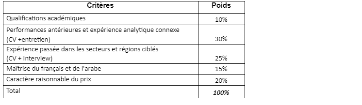 Les consultants seront évalués et classés par un comité d’évaluation selon les conditions décrites dans les critères d’évaluation ci-dessous, avec une valeur globale maximale de 100 points. Les consultants seront d’abord évalués et notés d’un point de vue technique. Les consultants considérés comme techniquement qualifiés seront ensuite évalués en termes de coût raisonnable de leur taux journalier. Le contrat sera attribué au consultant ayant obtenu la meilleure note combinée sur le plan technique et sur le plan des coûts.