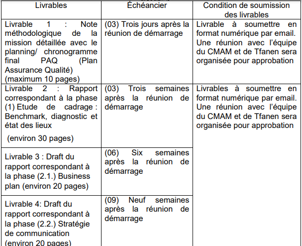 Dès la réunion de démarrage, les consultants-experts fixeront, en concertation avec le comité de pilotage, un calendrier de travail précisant les dates des différents livrables. Il s’agit de: