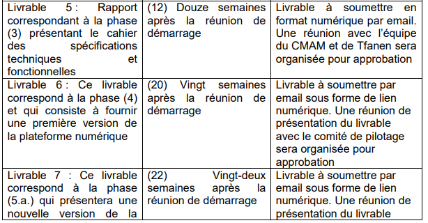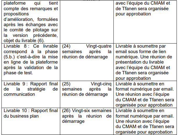 Dès la réunion de démarrage, les consultants-experts fixeront, en concertation avec le comité de pilotage, un calendrier de travail précisant les dates des différents livrables. Il s’agit de: