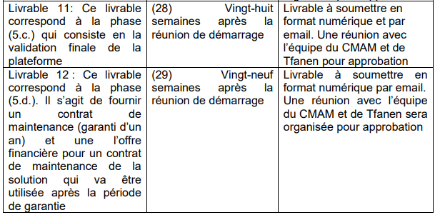 Ce contrat sera soumis à l’approbation du CMAM avant d’entrer en vigueur. Les consultants-experts fourniront également une offre financière pour un contrat de maintenance de trois ans de la solution qui va être utilisée après la période de garantie d’un an.