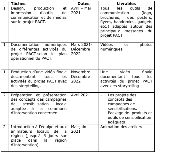 Les services de communication et de visibilité doivent aider PACT à assurer la visibilité  du projet et à mener avec succès des campagnes de sensibilisation ciblant les  partenaires et les bénéficiaires du projet.