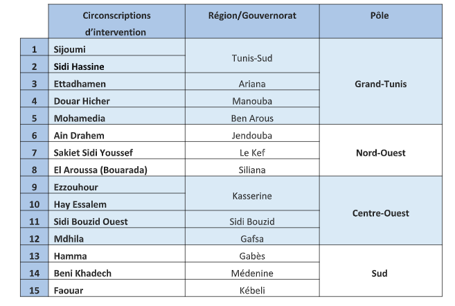 Les activités du projet « SEHATY » sont mises en œuvre au niveau de 15 circonscriptions sanitaires identifiées dans les 13 zones ciblées par le programme «Essaha Aziza», réparties en 4 pôles :